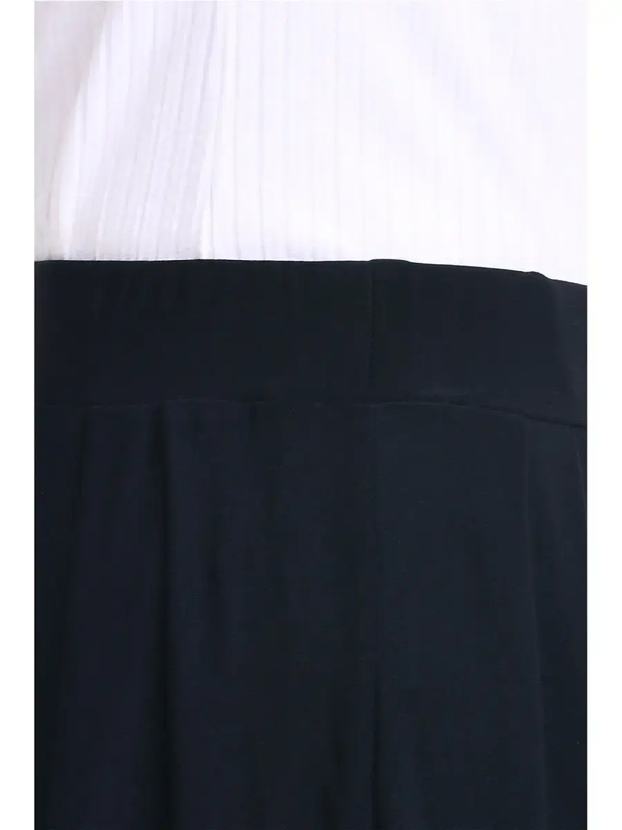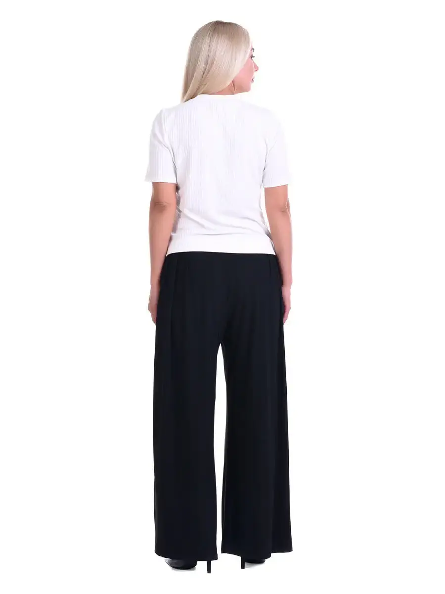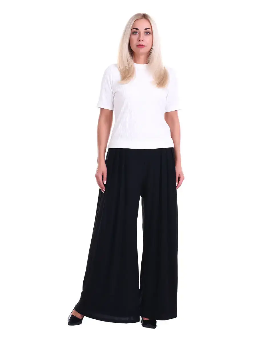 Стильные широкие брюки-палаццо, расклешенные от бедра, из струящегося тонкого трикотажа со средней комфортной посадкой, круговым эластичным поясом с защипами, мягко управляющими драпировкой. Свободный крой и длина модели до середины каблука визуально удлиняют ноги, маскируют нюансы фигуры, придают образу особый шик и чувственность. Изделие удачно совмещает в себе удобство брюк и женственность юбки.