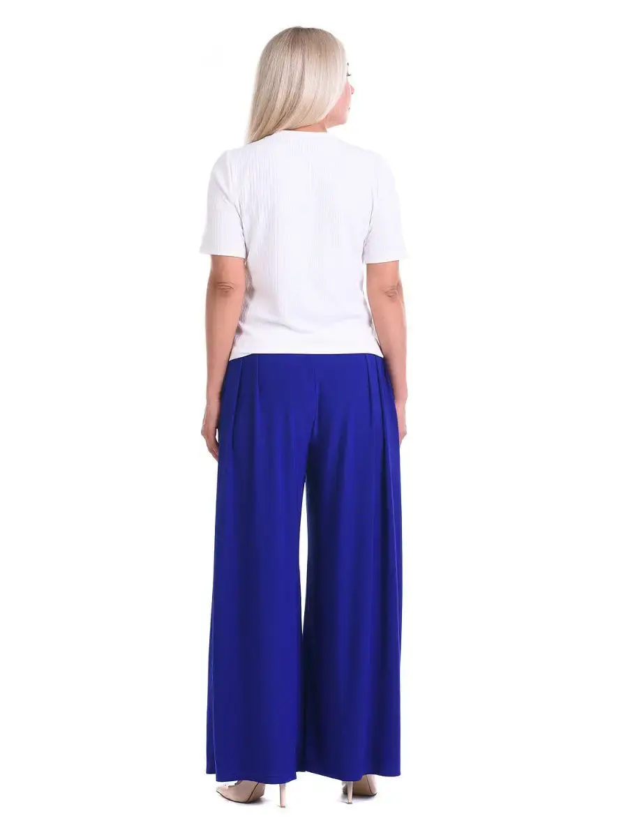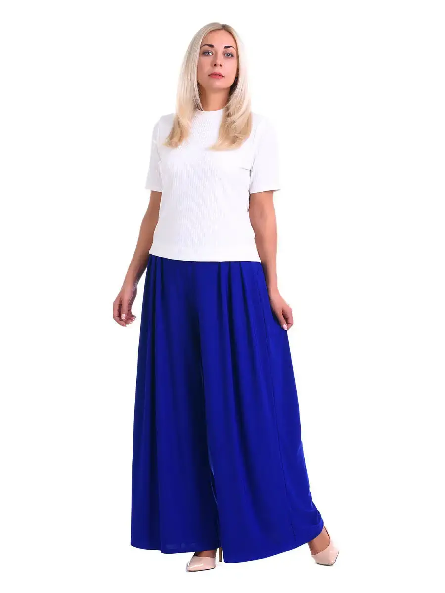 Стильные широкие брюки-палаццо, расклешенные от бедра, из струящегося тонкого трикотажа со средней комфортной посадкой, круговым эластичным поясом с защипами, мягко управляющими драпировкой. Свободный крой и длина модели до середины каблука визуально удлиняют ноги, маскируют нюансы фигуры, придают образу особый шик и чувственность. Изделие удачно совмещает в себе удобство брюк и женственность юбки.