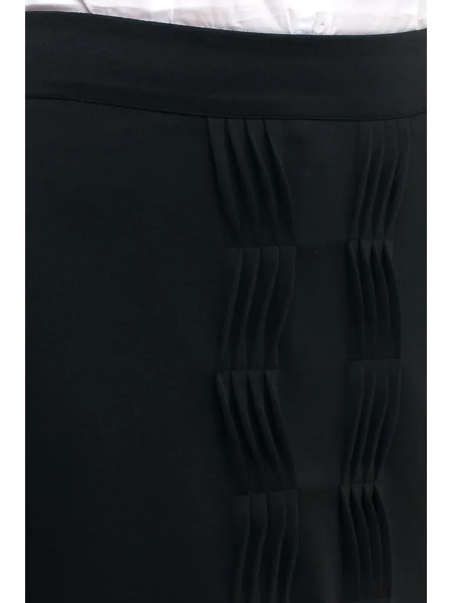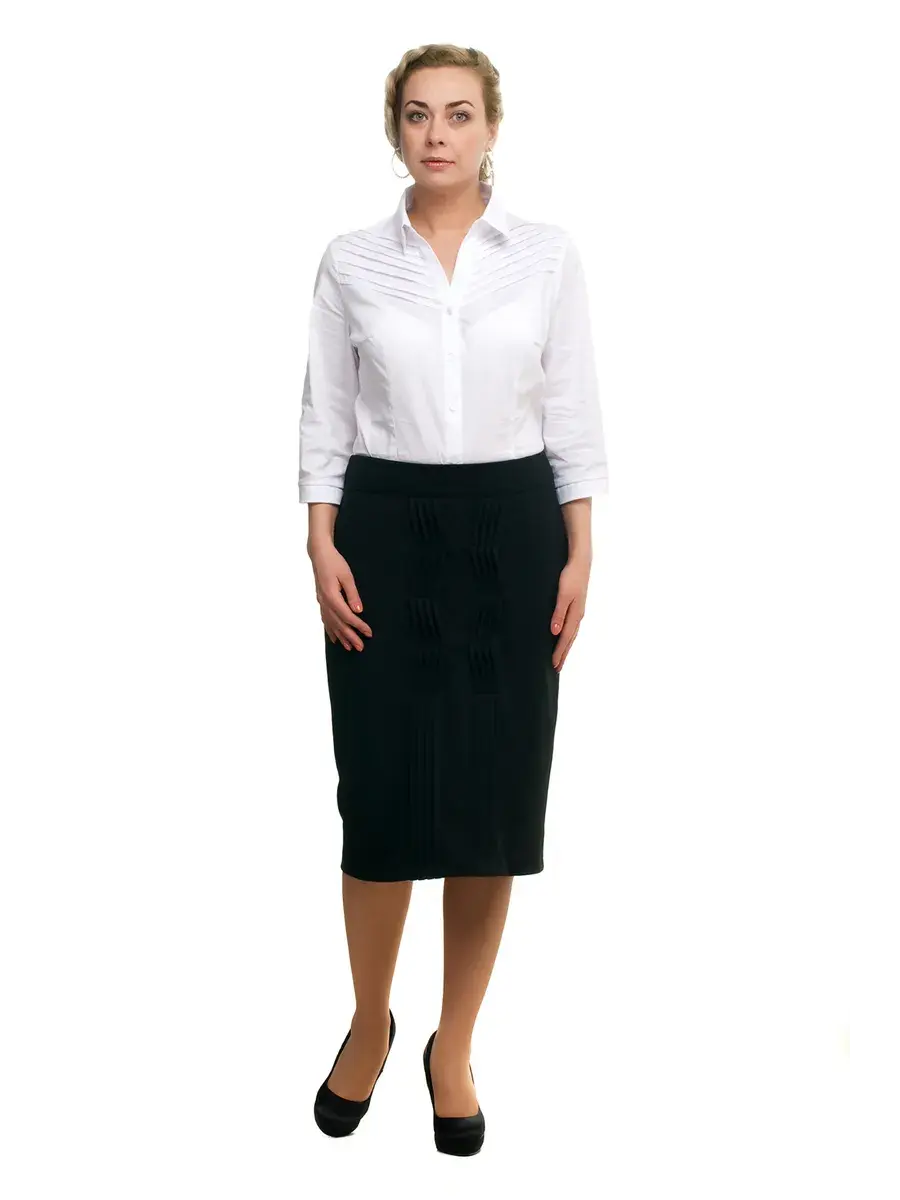 Стильная юбка-карандаш длиной чуть ниже колен из плотного тонкого трикотажа. Модель сильно заужена книзу; на эластичном поясе с комфортной посадкой; с застежкой-молнией и разрезом-шлицей сзади. Изюминка модели, - декоративно-конструктивные вертикальные защипы спереди, «рисующие» силуэт, придающие ему подтянутость и грацию. Юбка идеальный вариант как для работы в офисе, так и для торжественных мероприятий.