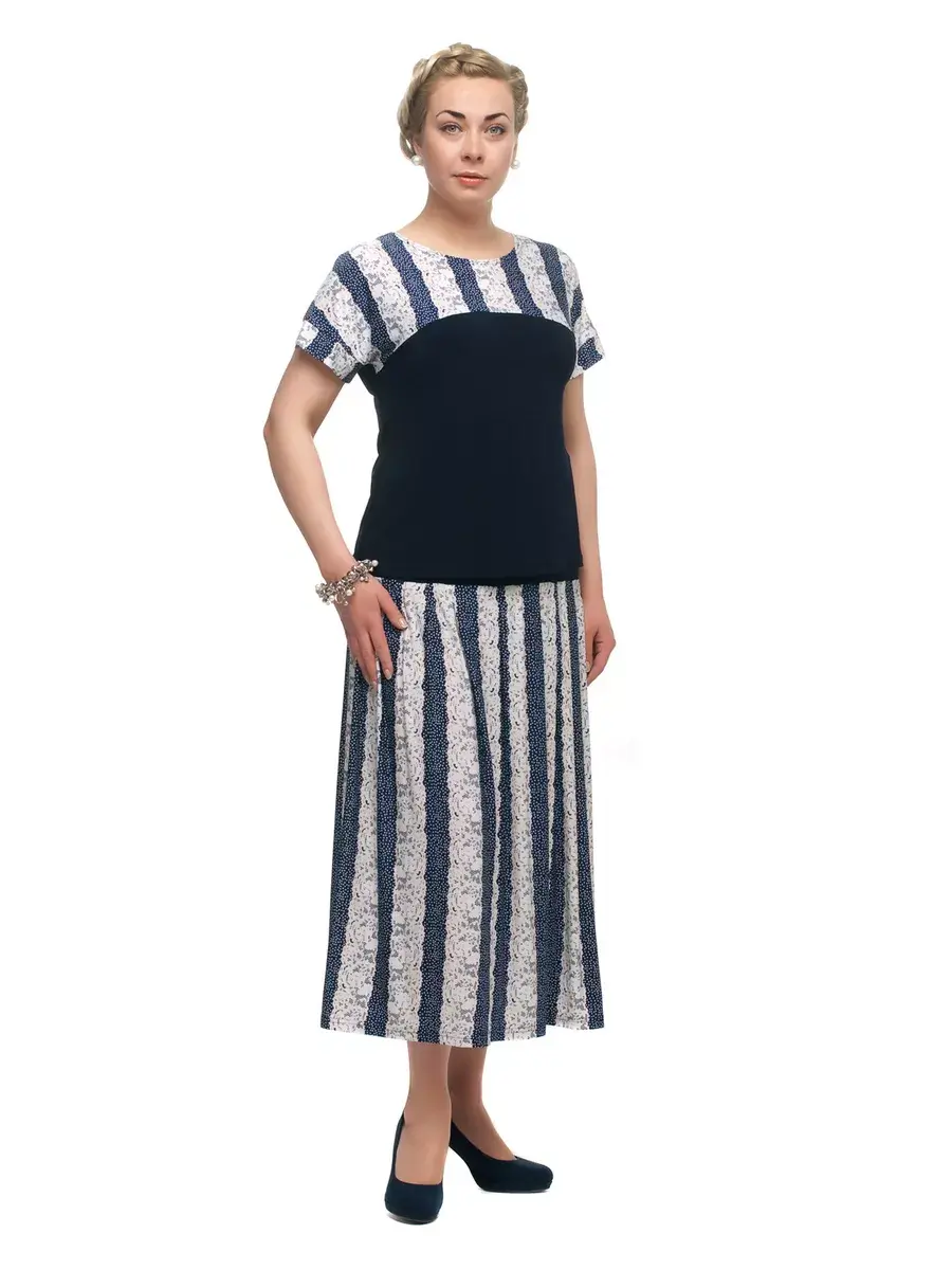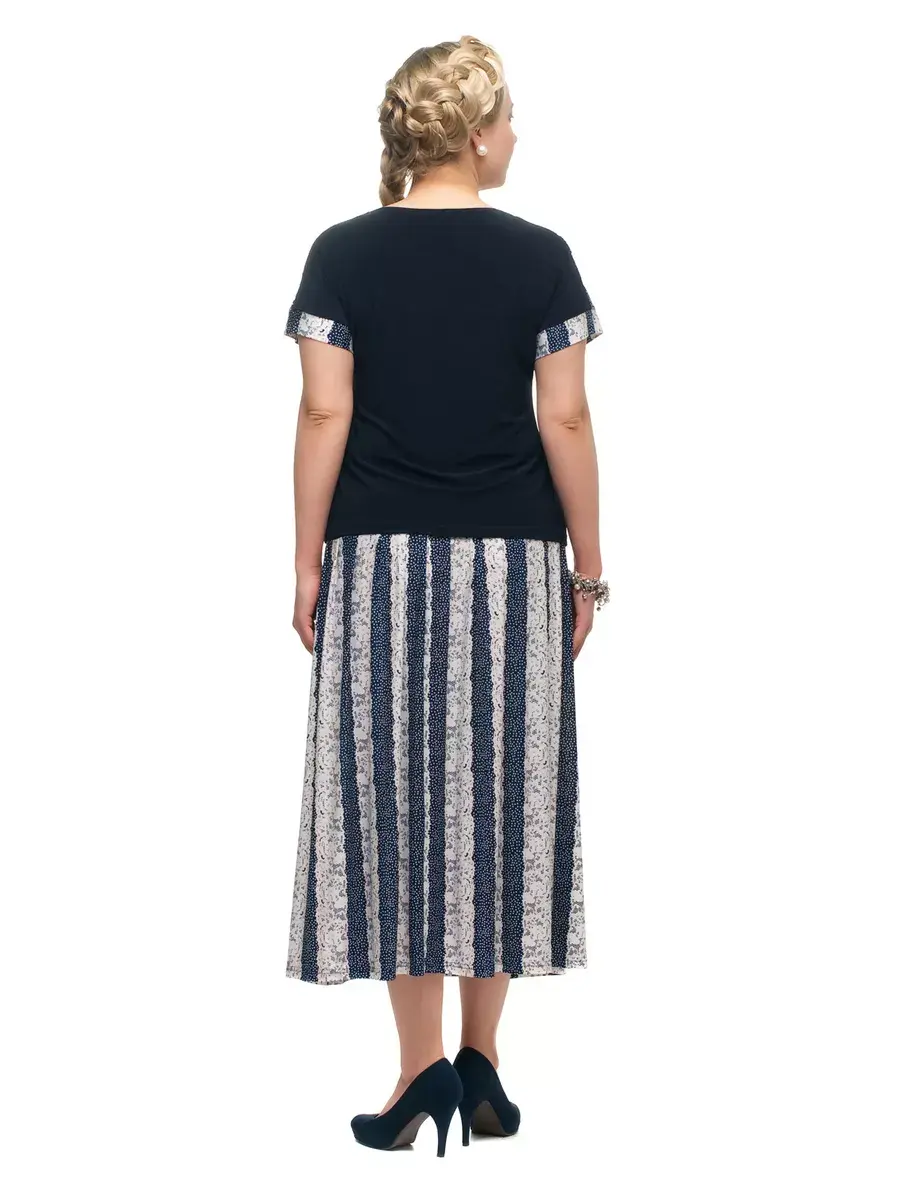 Эффектная юбка больших размеров от бренда OLSI длиной миди, из струящейся ткани с комбинированным принтом - широкие ажурные полосы на фоне мелкого горошка. Женская юбка выполнена из трикотажа масло. Изделие отрезное по бедрам, на однотонной кокетке с удобным поясом с резинкой. Вертикальная полоска визуально делает ноги длиннее, вытягивает силуэт, клеш от самой высокой точки бедер вуалирует особенности фигуры. Горошек и имитация кружев придает образу романтические нотки. Модель подходит тем, кто ценит комфорт.