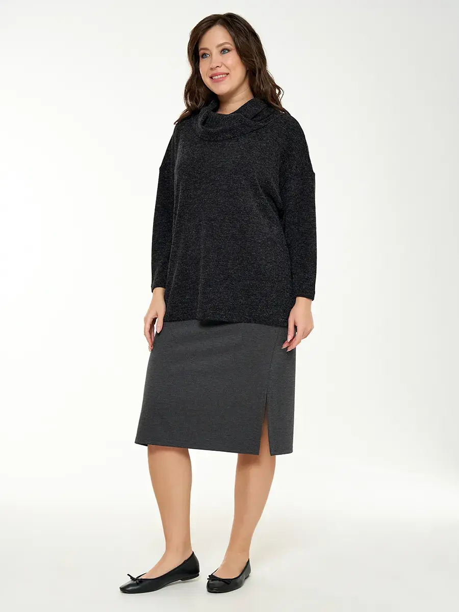 Юбка больших размеров выполнена из плотного приятного на ощупь трикотажного полотна на резинке с разрезом. Длина юбки во всех размерах 77см