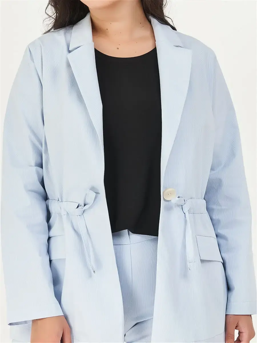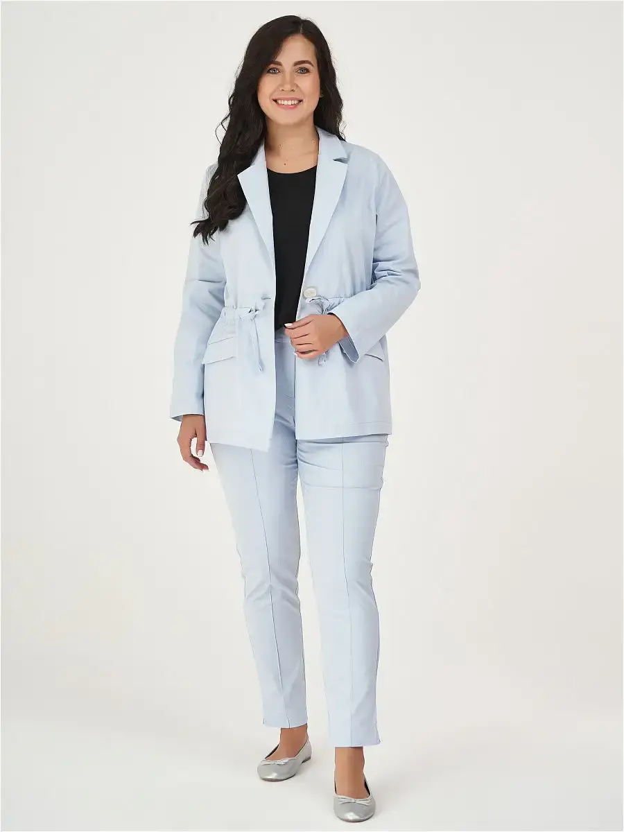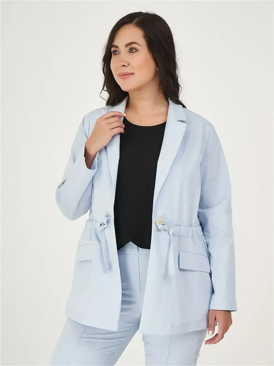 Жакет прямого силуэта свободной формы из однотонной костюмной ткани. Жакет с центральной бортовой застёжкой-планкой, на 1 пуговицу. Перед с функциональными прорезными карманами с клапаном. Воротник пиджачный отложной. Спинка цельнокроеная.
