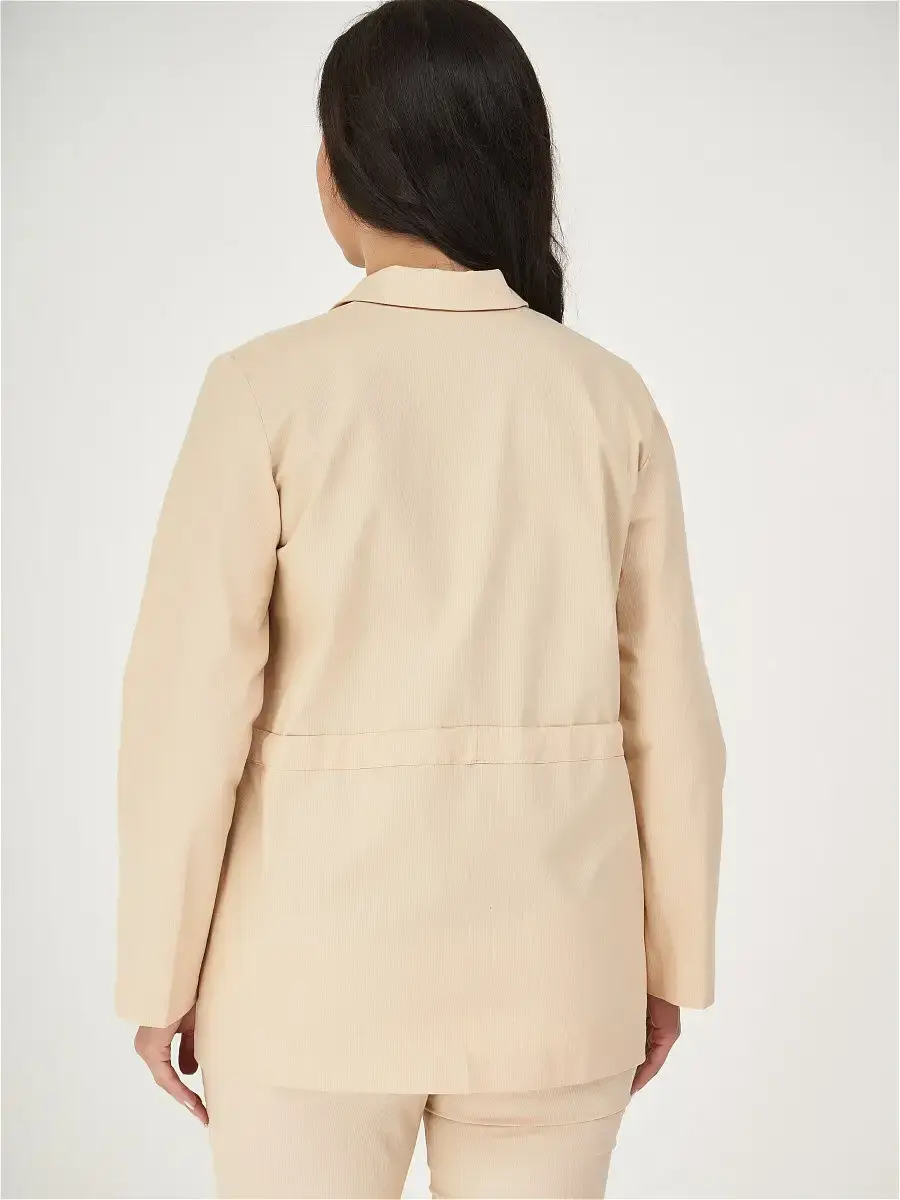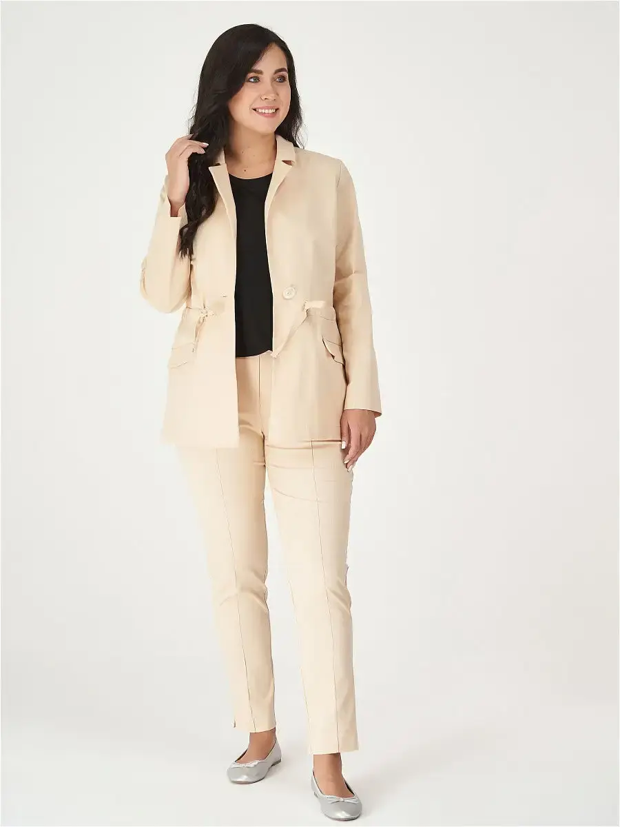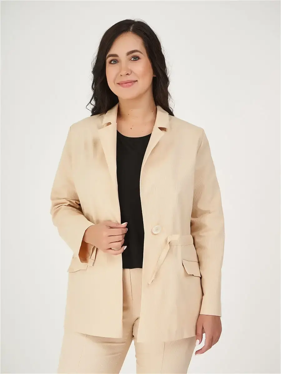 Жакет прямого силуэта свободной формы из однотонной костюмной ткани. Жакет с центральной бортовой застёжкой-планкой, на 1 пуговицу. Перед с функциональными прорезными карманами с клапаном. Воротник пиджачный отложной. Спинка цельнокроеная.