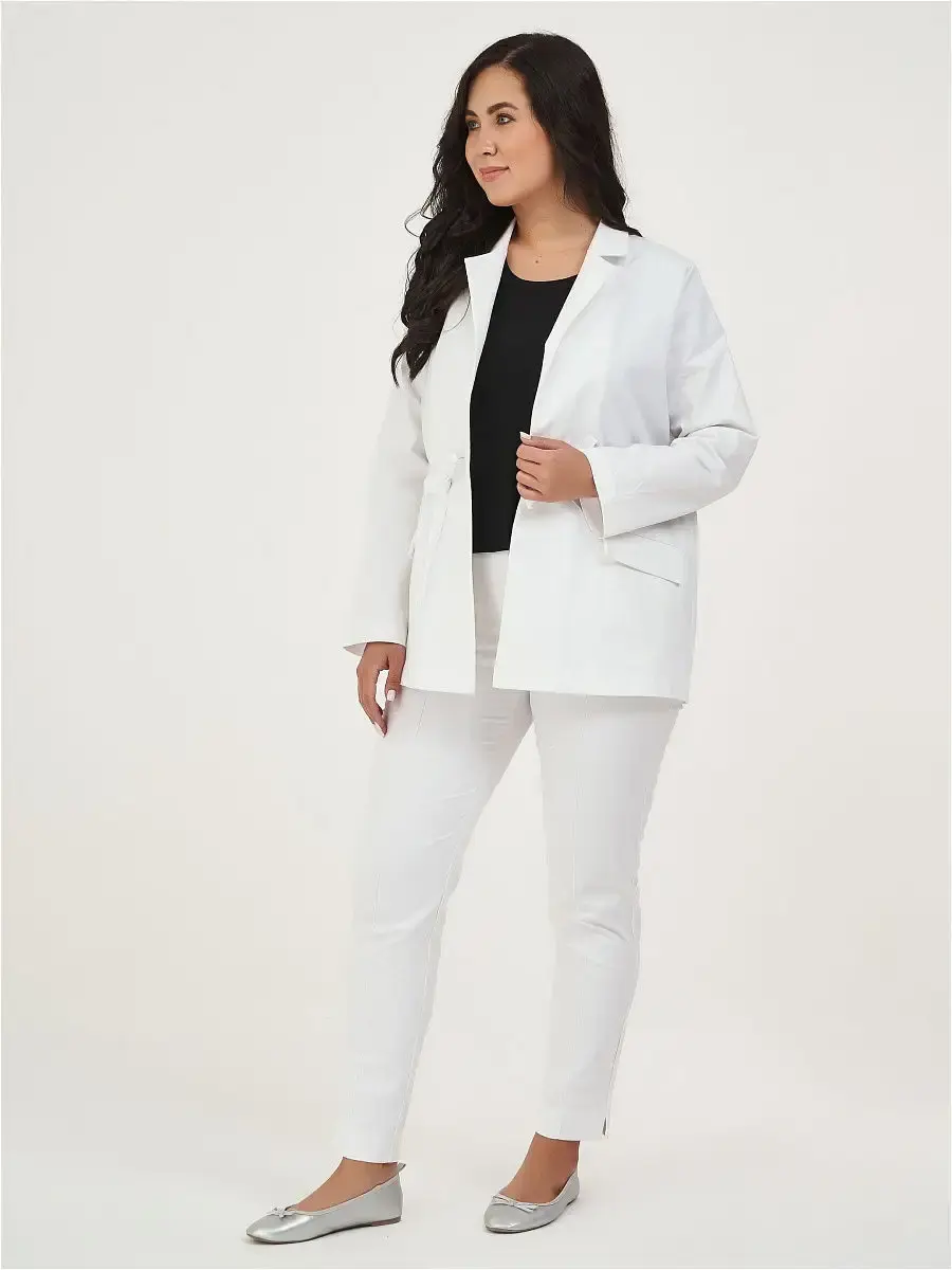Жакет прямого силуэта свободной формы из однотонной костюмной ткани. Жакет с центральной бортовой застёжкой-планкой, на 1 пуговицу. Перед с функциональными прорезными карманами с клапаном. Воротник пиджачный отложной. Спинка цельнокроеная.
