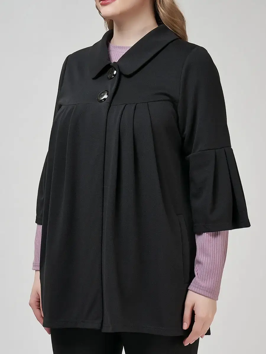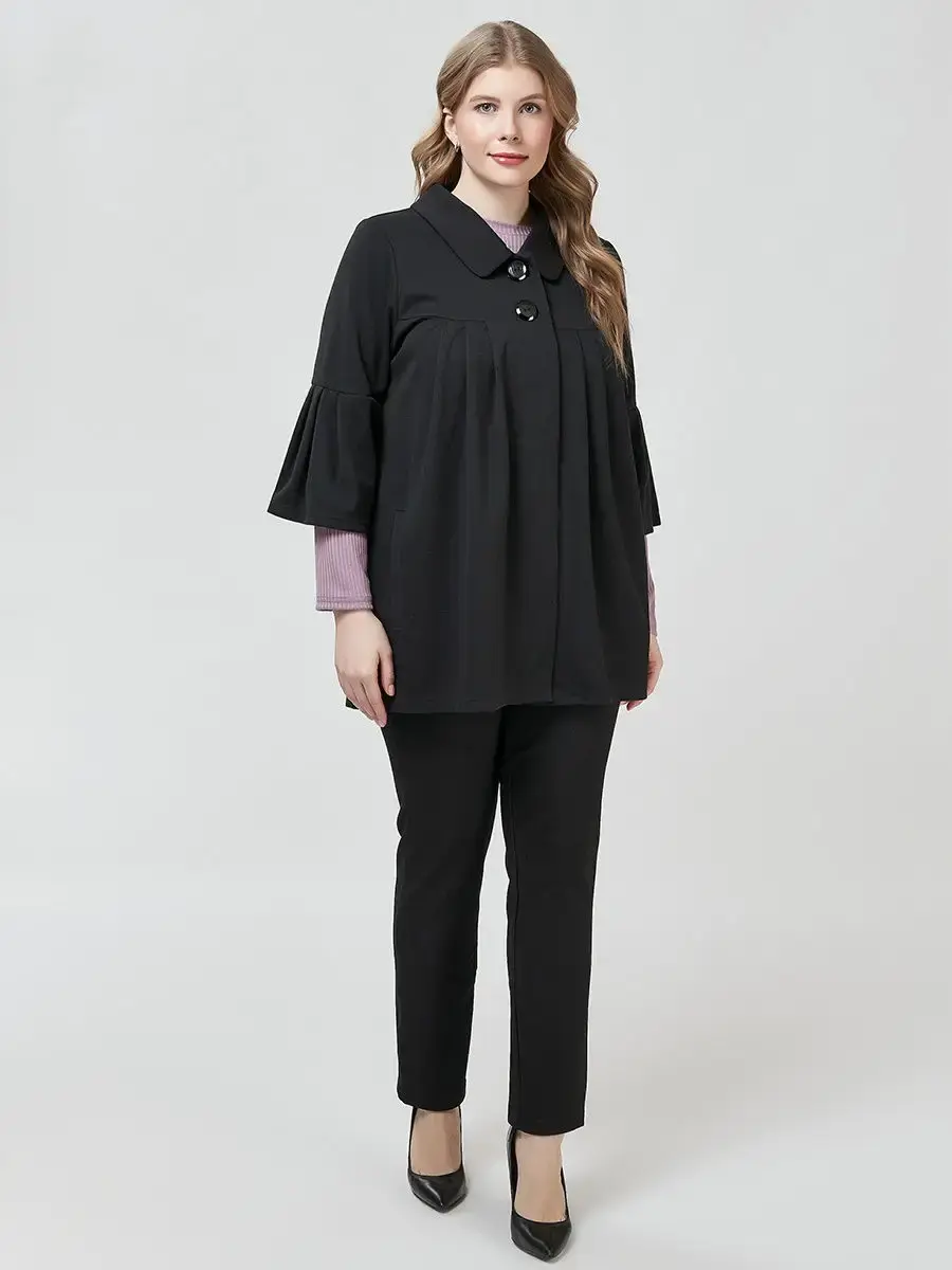 Стильный жакет фантазийного кроя из мягкого трикотажа с отрезными рукавами с воланами, длиной 3/4. Модель на квадратной кокетке с защипами, драпирующими ткань от линии груди, отложным круглым воротником и неглубокой V-образной горловиной. Застежка сверху на двух крупных декоративных пуговицах.