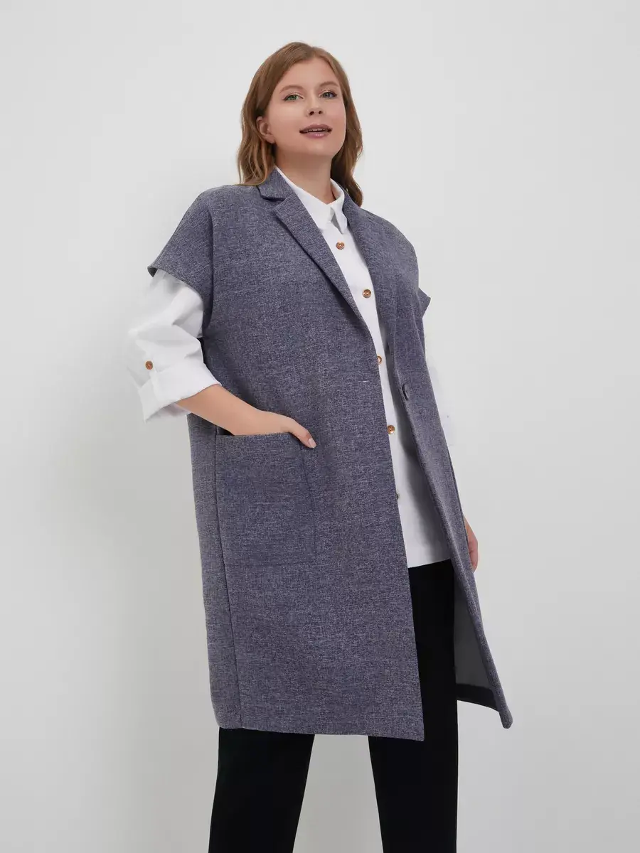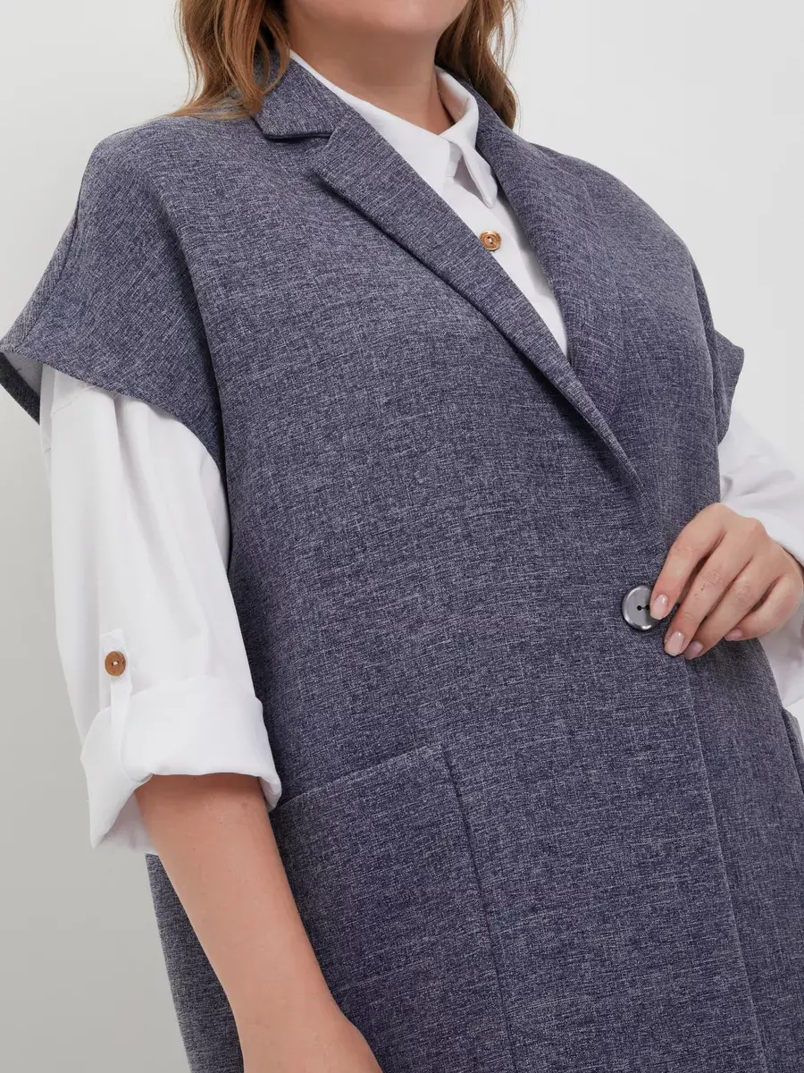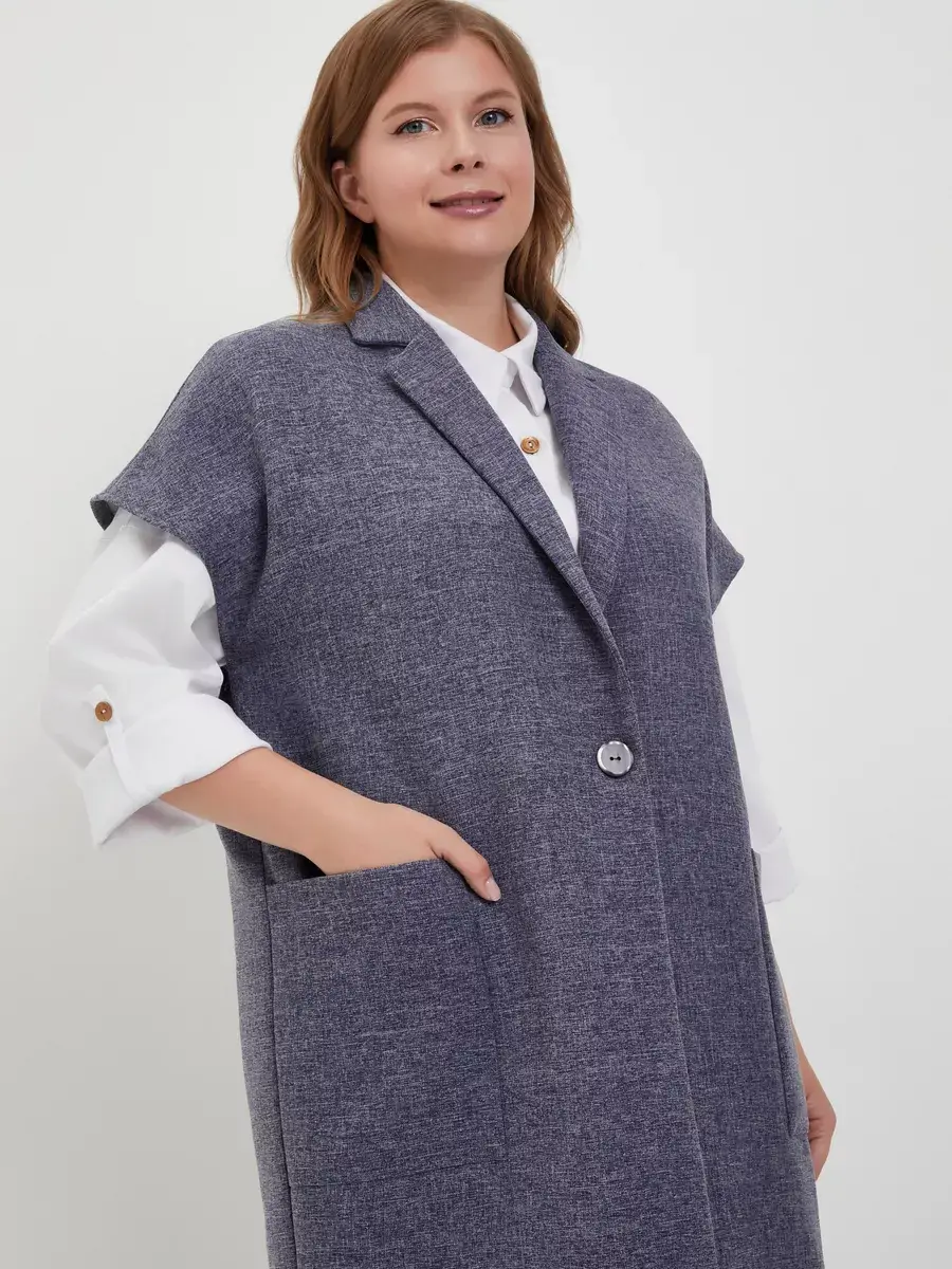 Жакет без рукавов больших размеров из плотного текстильного полотна, с карманами, застёгивается на пуговицу. Жилет удлиненный женский для офиса