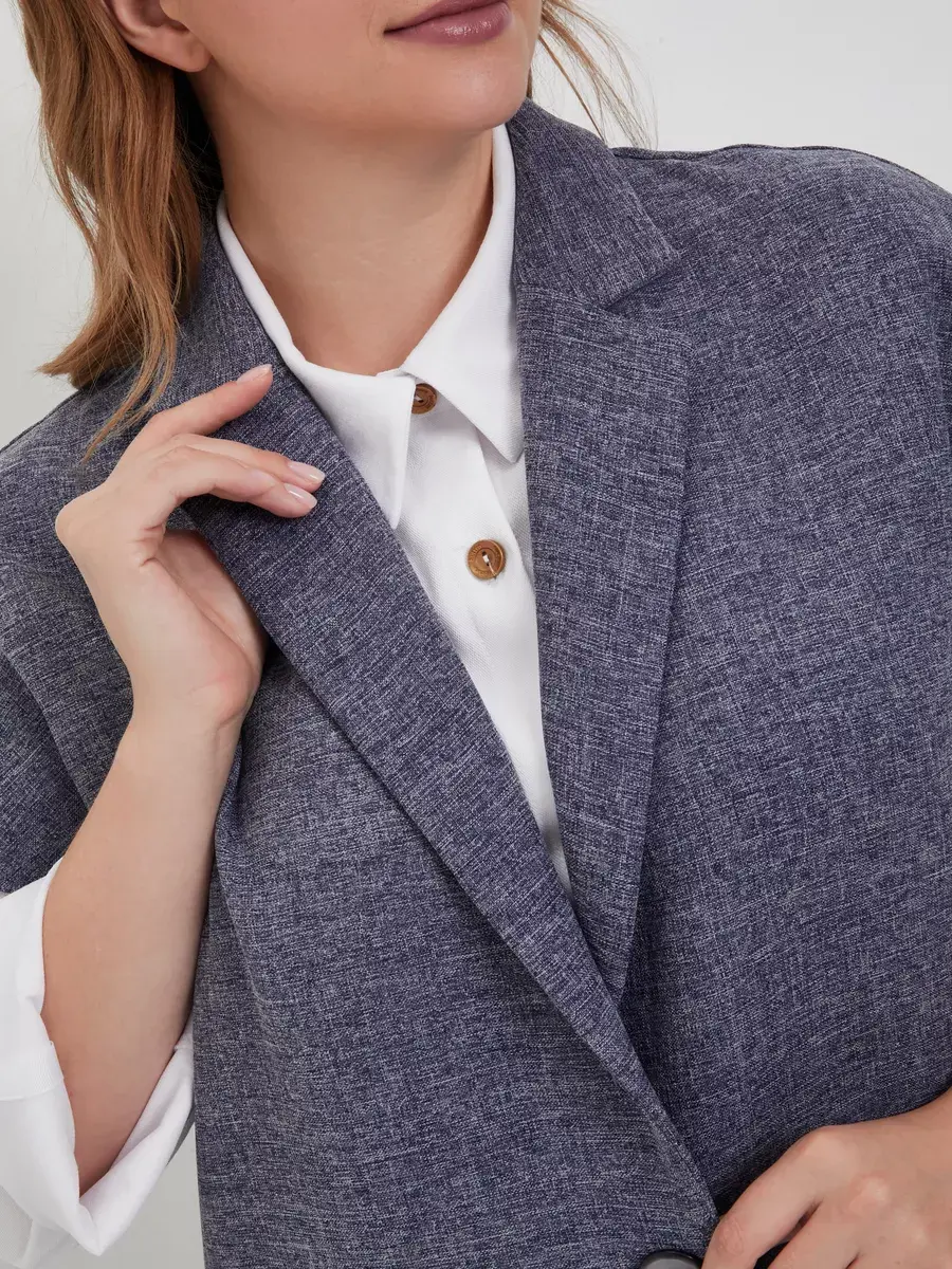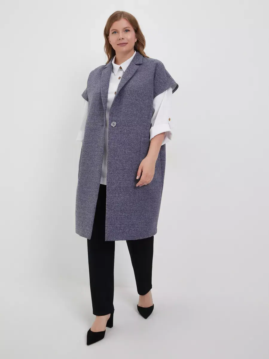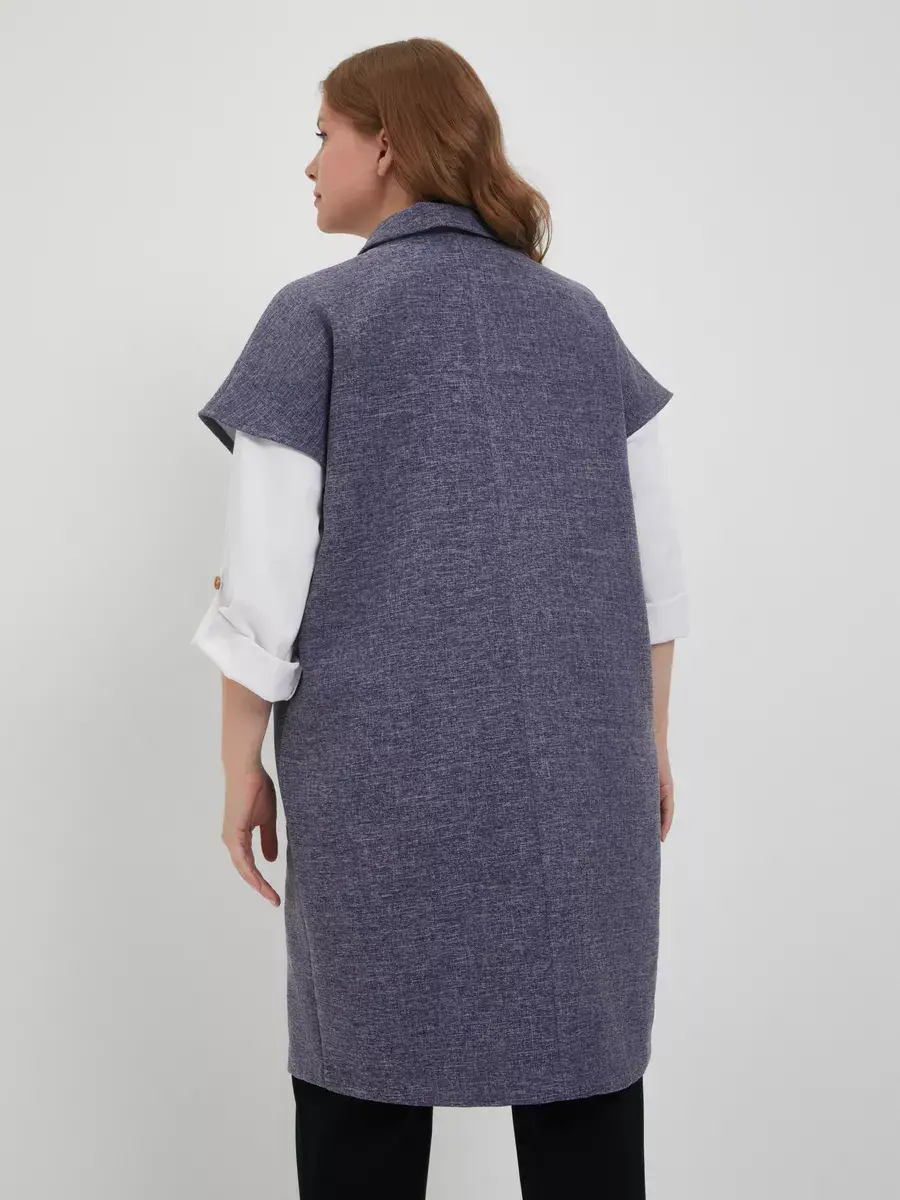 Жакет без рукавов больших размеров из плотного текстильного полотна, с карманами, застёгивается на пуговицу. Жилет удлиненный женский для офиса