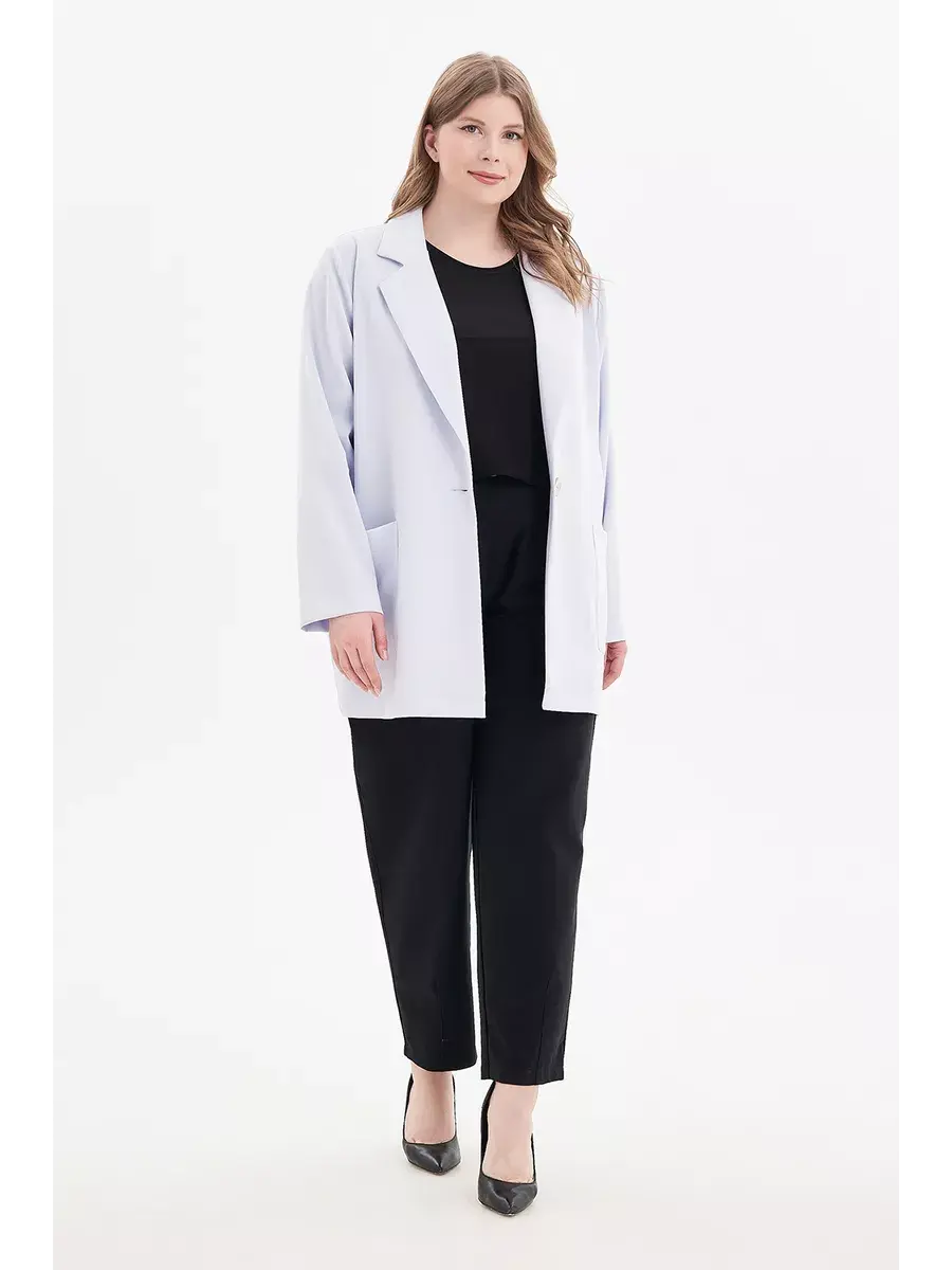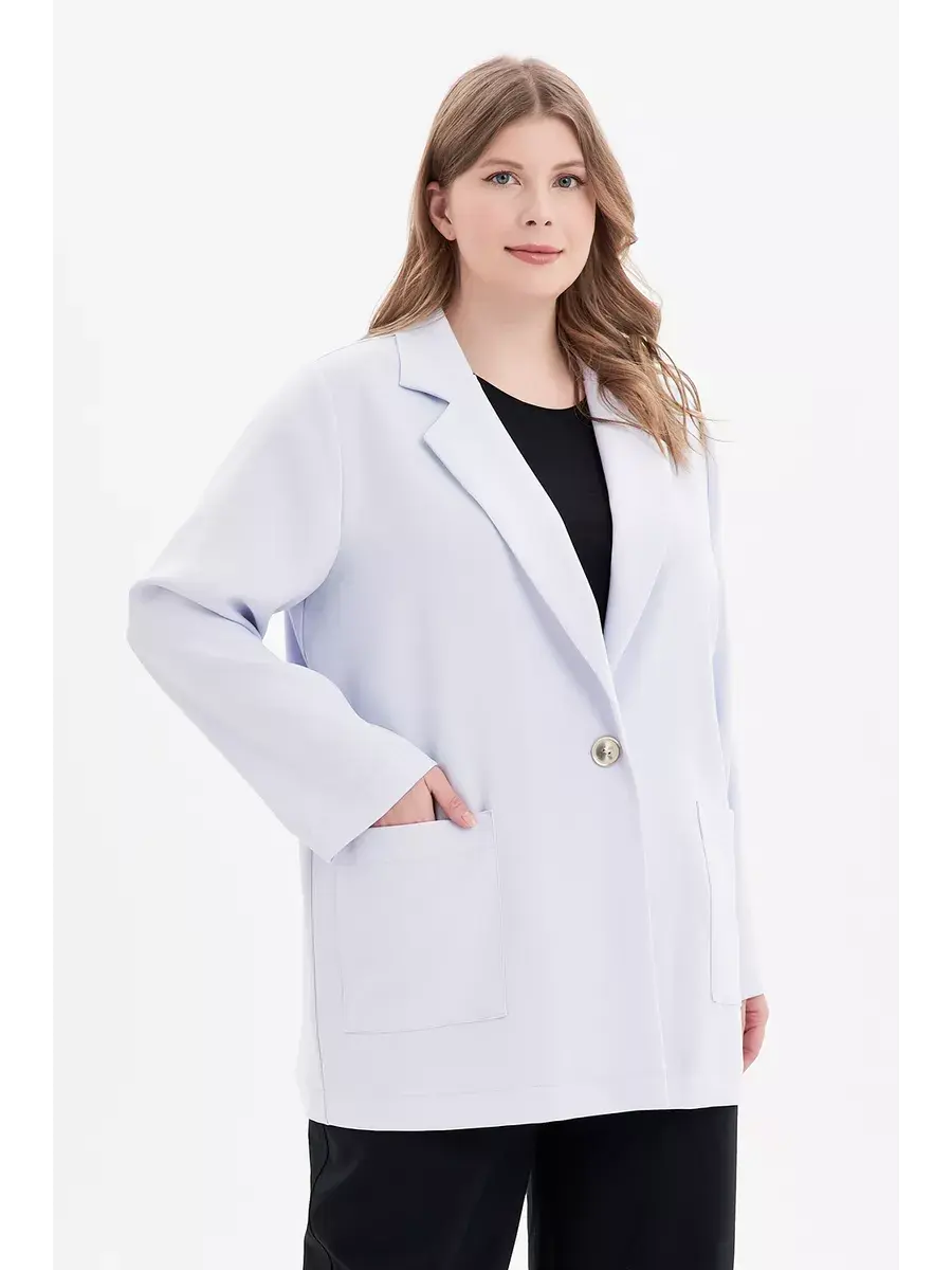 Жакет женский больших размеров бренда OLSI выполнен из мягкого текстильного полотна с длинным рукавом, спереди с функциональными накладными карманами. Женский легкий пиджак без подкладки. Воротник отложной пиждачного типа. Женский летний блайзер застегивается на одну пуговицу.