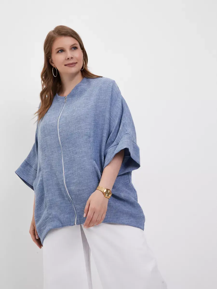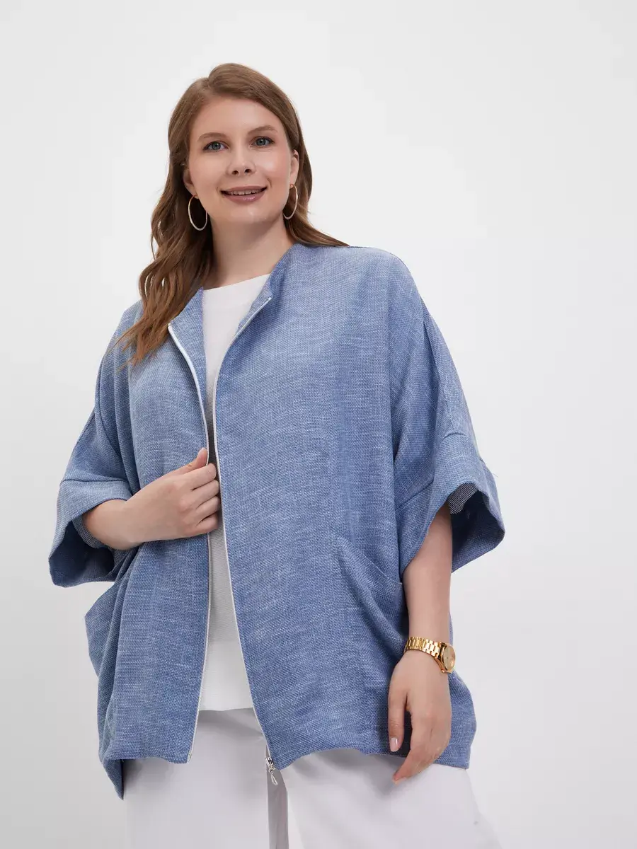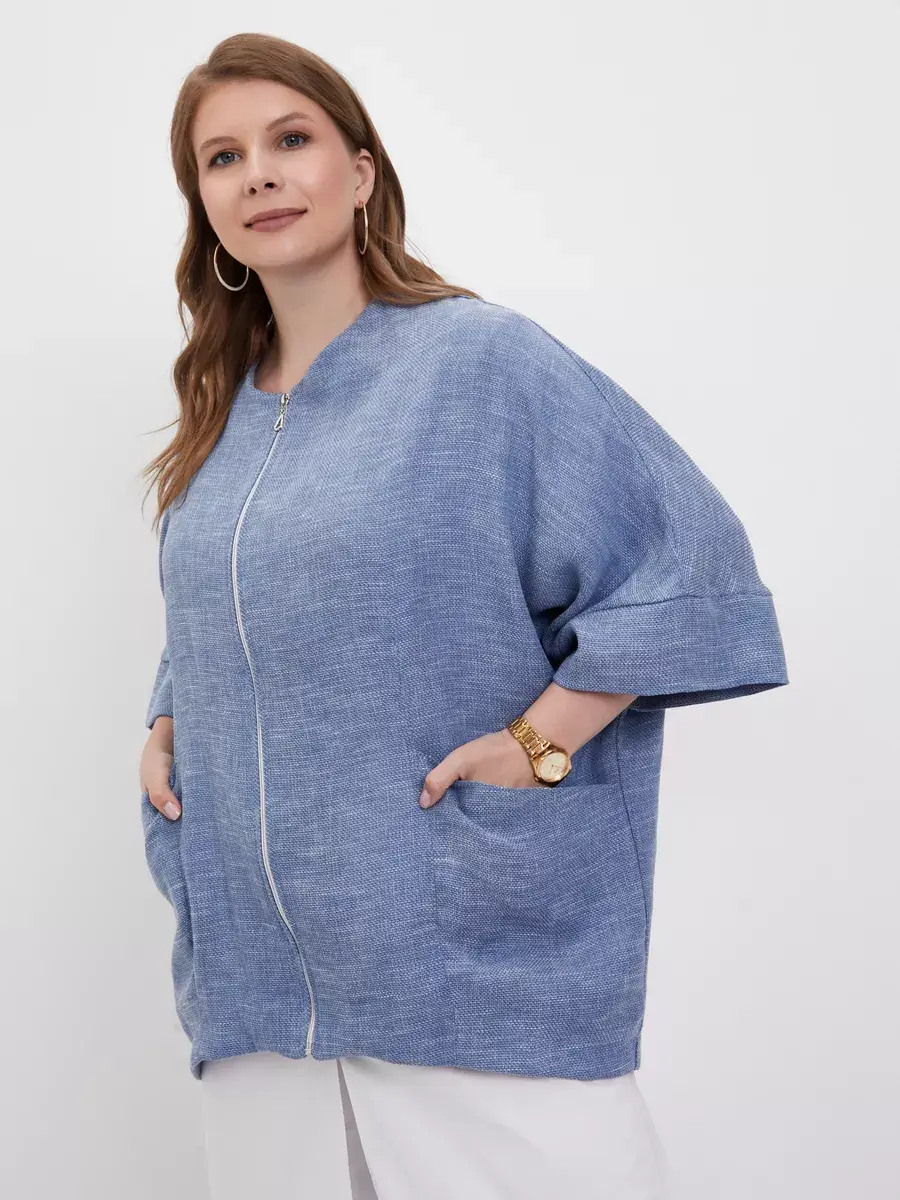 Женский летний жакет больших размеров от бренда OLSI из мягкого текстильного полотна по типу рогожки, мешковины. Легкий жакет Олси фасона оверсайз, удлиненный сзади, с накладными карманами, застежка на молнии. Рукав широкий длиной 3/4.
