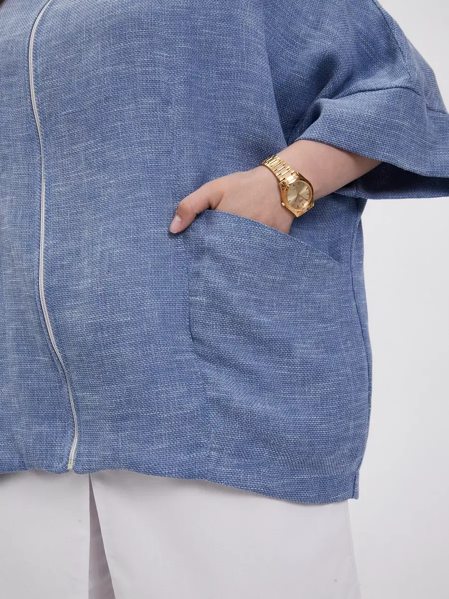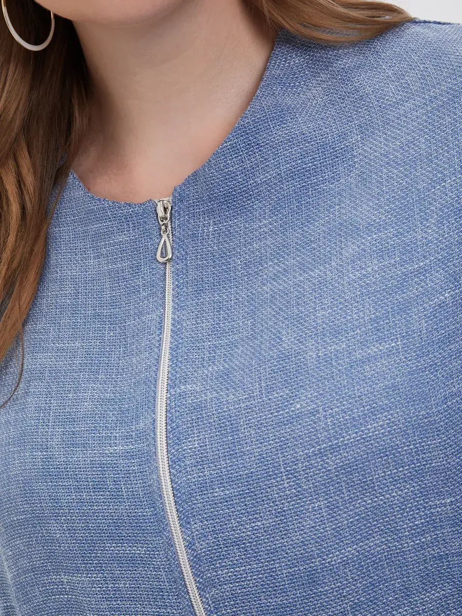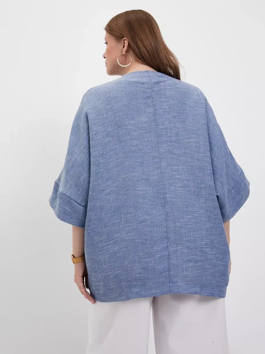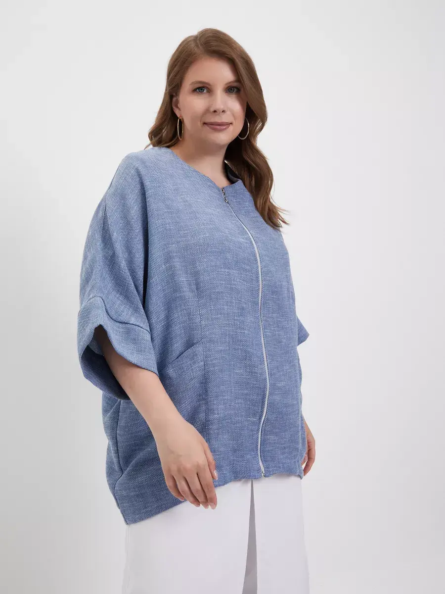 Женский летний жакет больших размеров от бренда OLSI из мягкого текстильного полотна по типу рогожки, мешковины. Легкий жакет Олси фасона оверсайз, удлиненный сзади, с накладными карманами, застежка на молнии. Рукав широкий длиной 3/4.