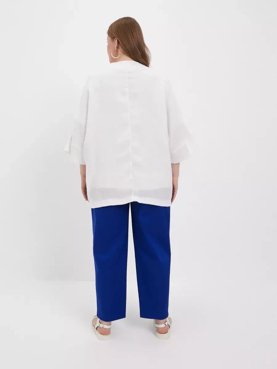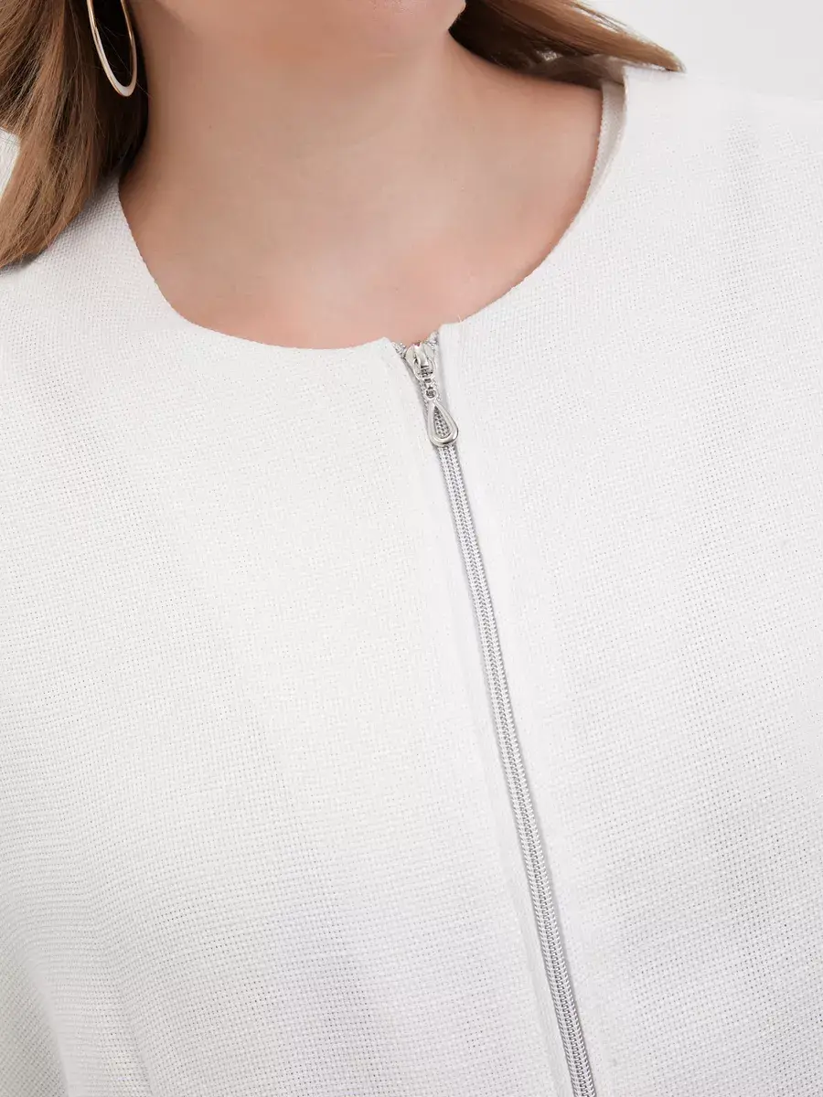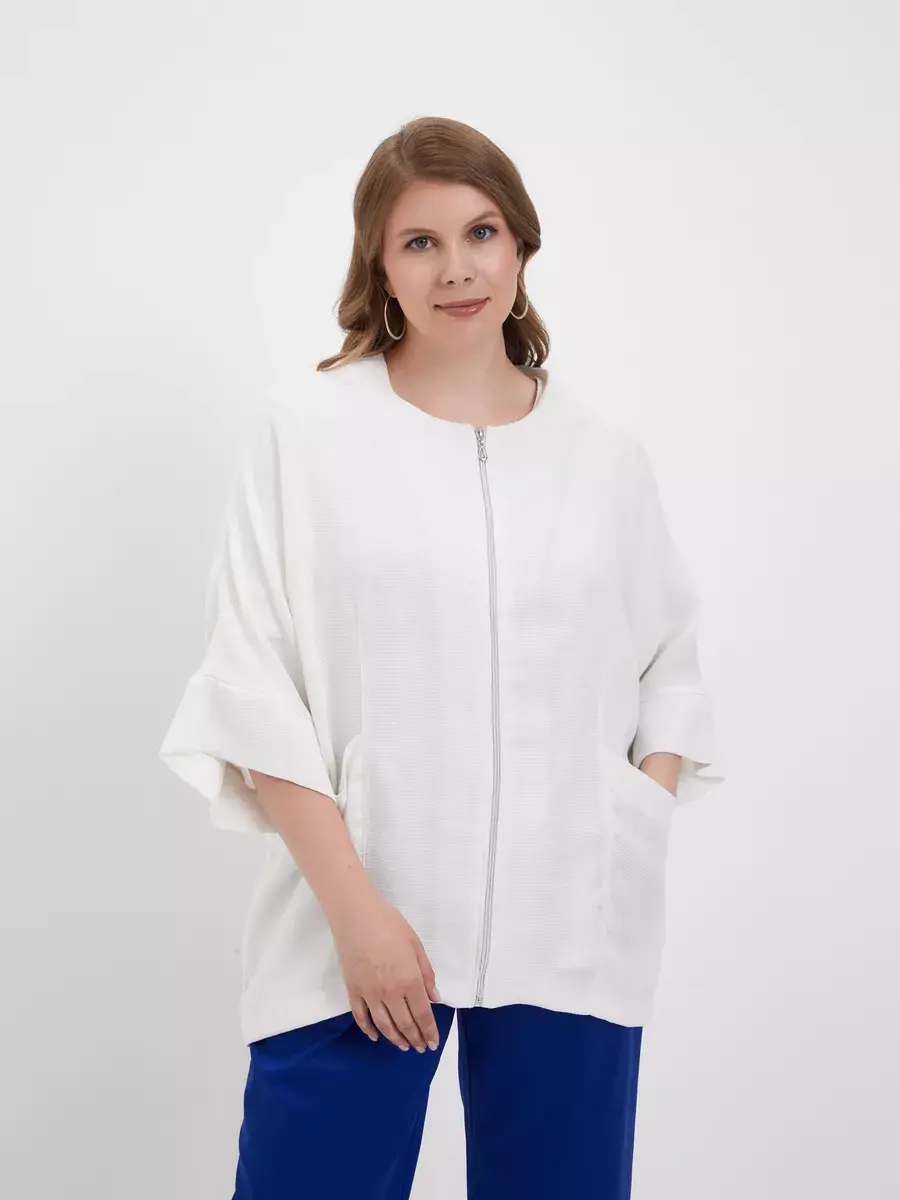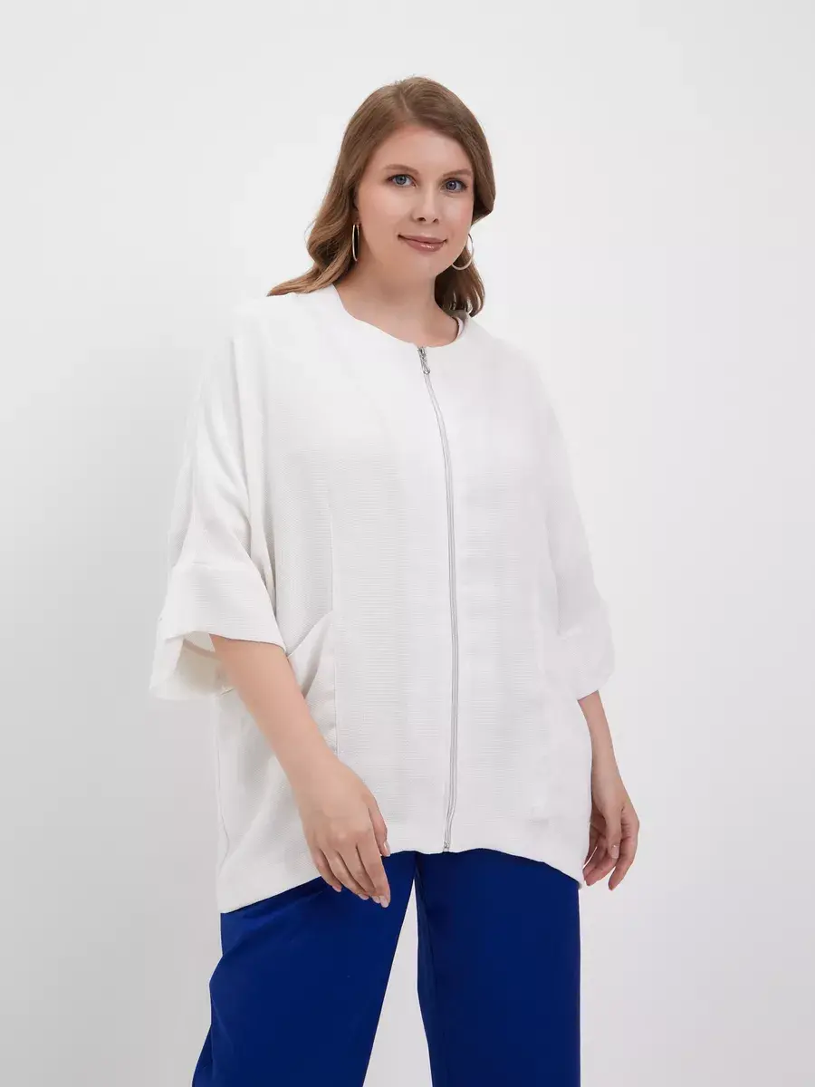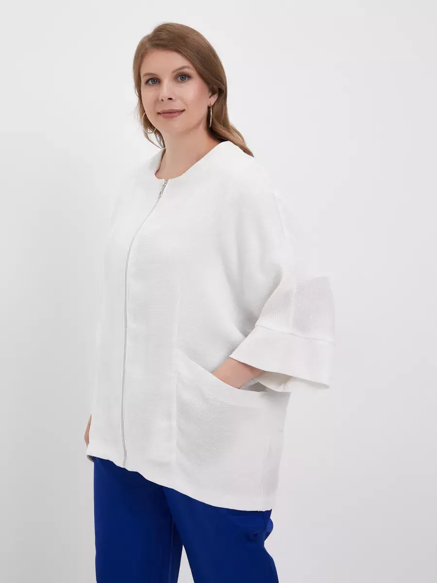 Женский летний жакет больших размеров от бренда OLSI из мягкого текстильного полотна по типу рогожки, мешковины. Легкий жакет Олси фасона оверсайз, удлиненный сзади, с накладными карманами, застежка на молнии. Рукав широкий длиной 3/4.
