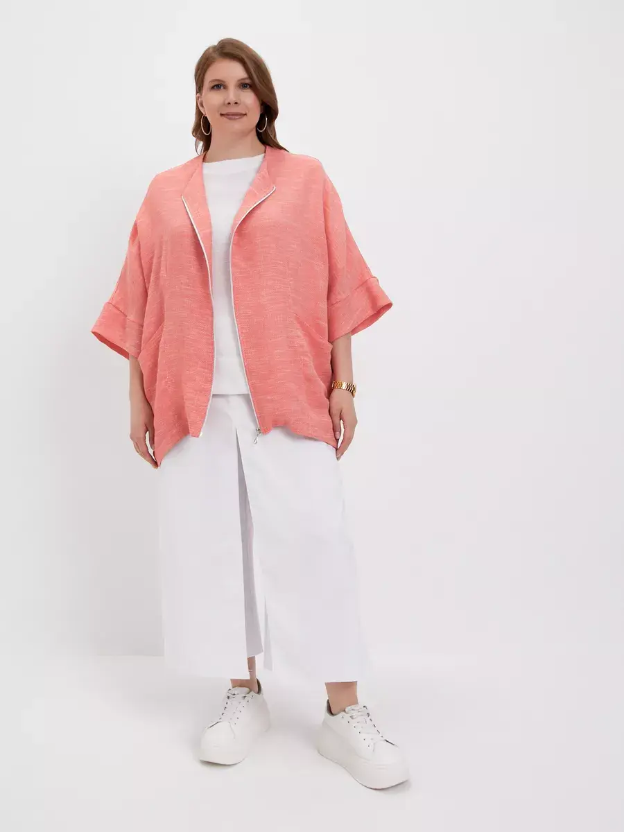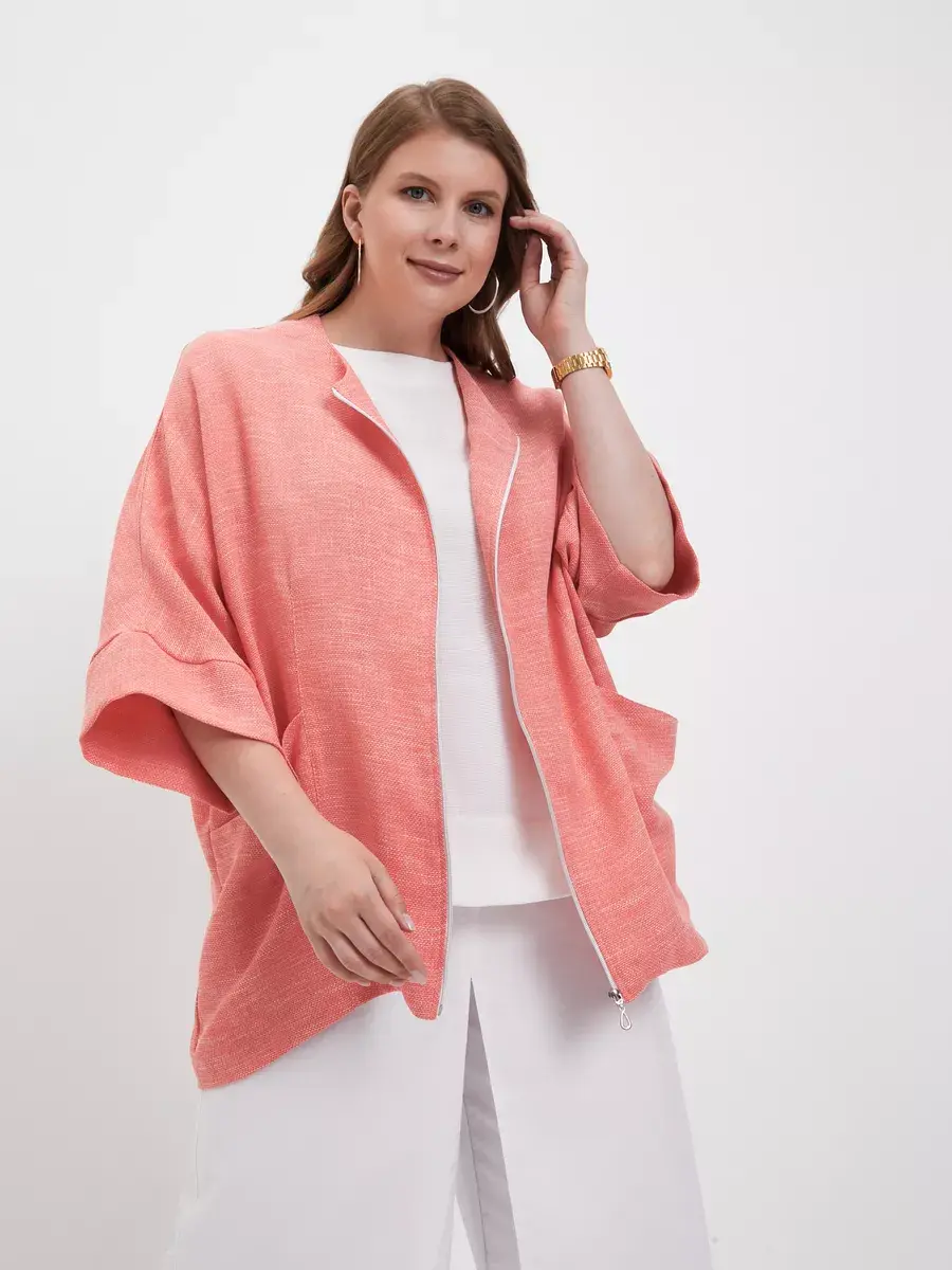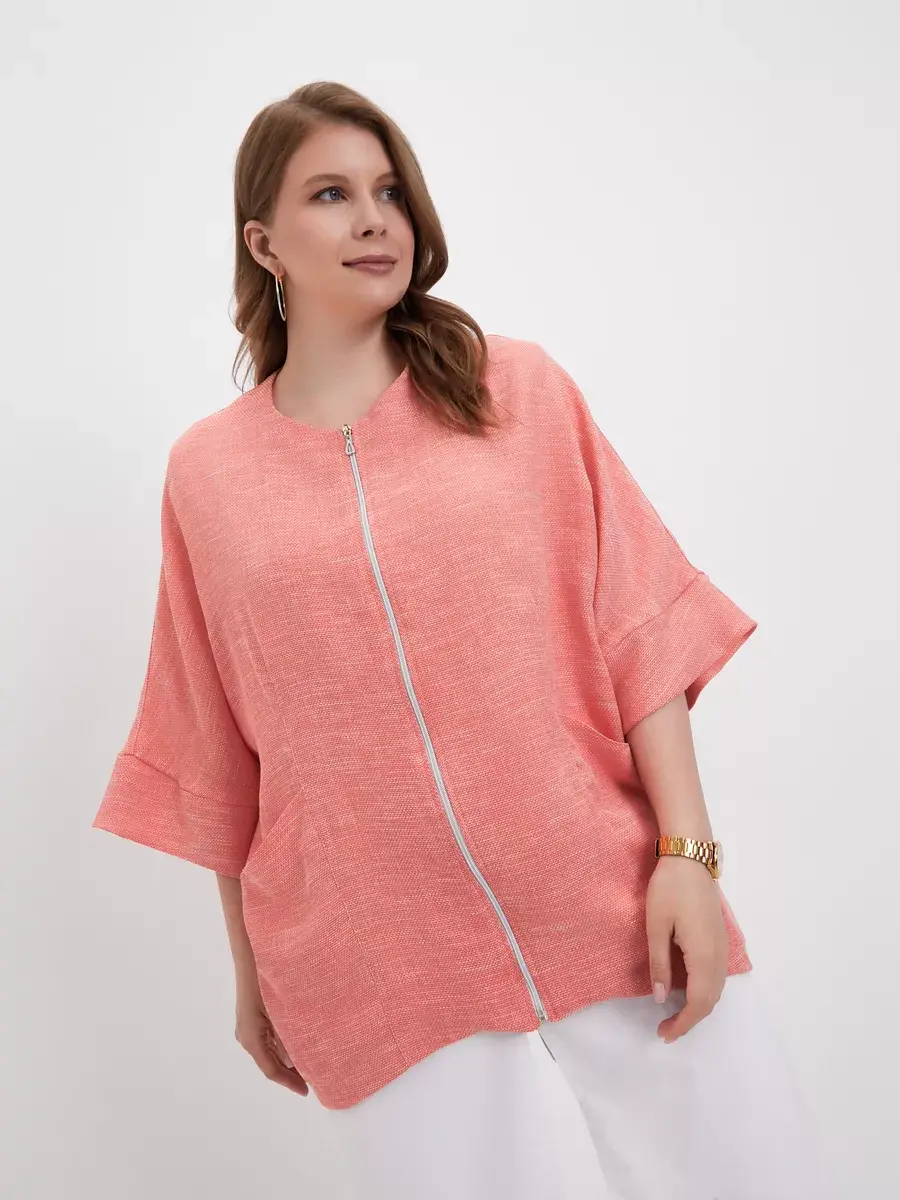 Женский летний жакет больших размеров от бренда OLSI из мягкого текстильного полотна по типу рогожки, мешковины. Легкий жакет Олси фасона оверсайз, удлиненный сзади, с накладными карманами, застежка на молнии. Рукав широкий длиной 3/4.