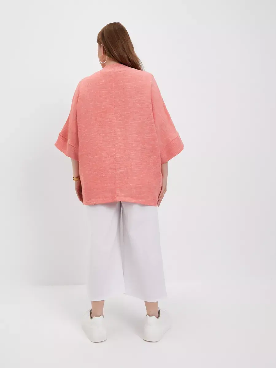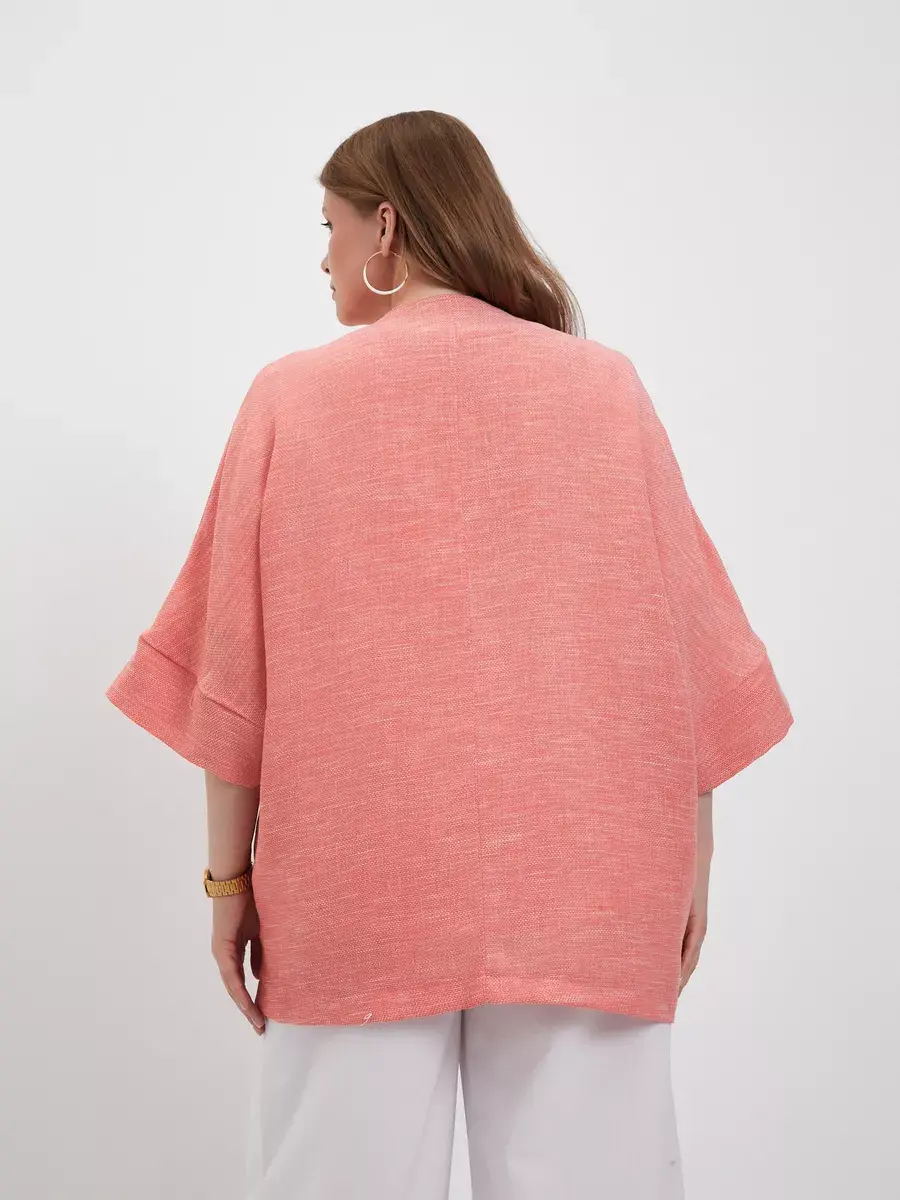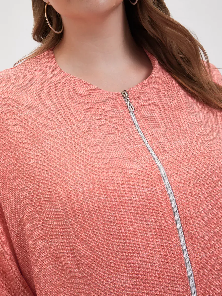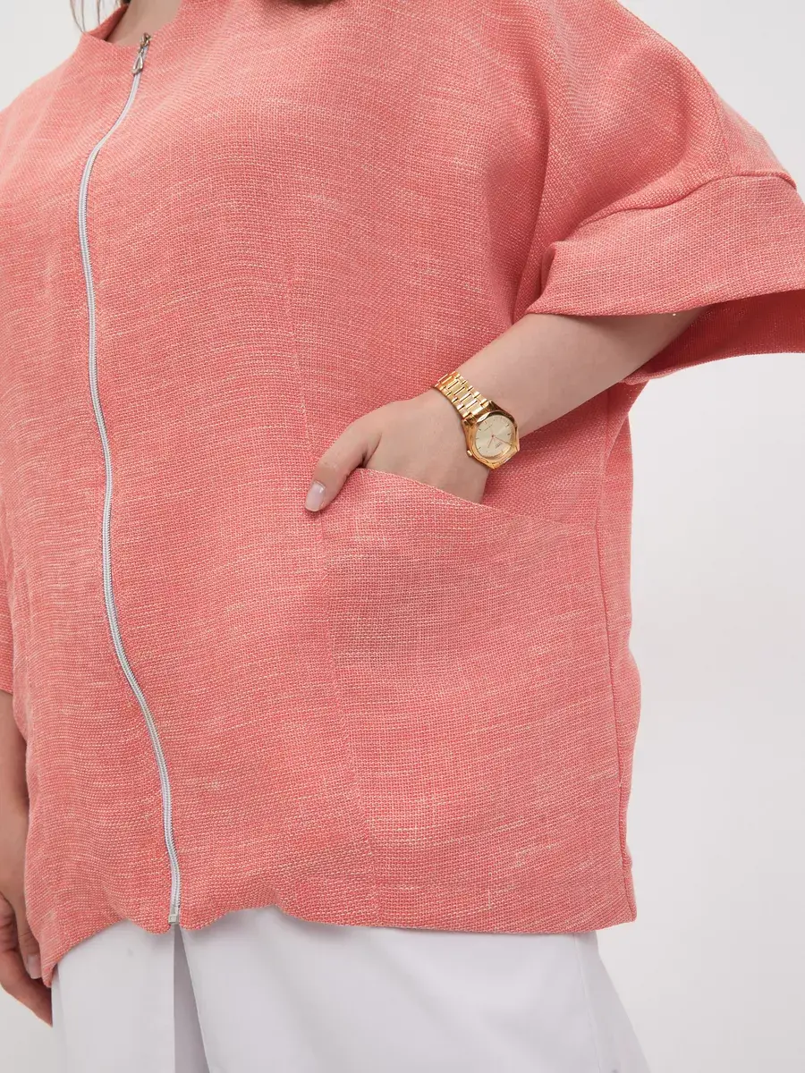 Женский летний жакет больших размеров от бренда OLSI из мягкого текстильного полотна по типу рогожки, мешковины. Легкий жакет Олси фасона оверсайз, удлиненный сзади, с накладными карманами, застежка на молнии. Рукав широкий длиной 3/4.