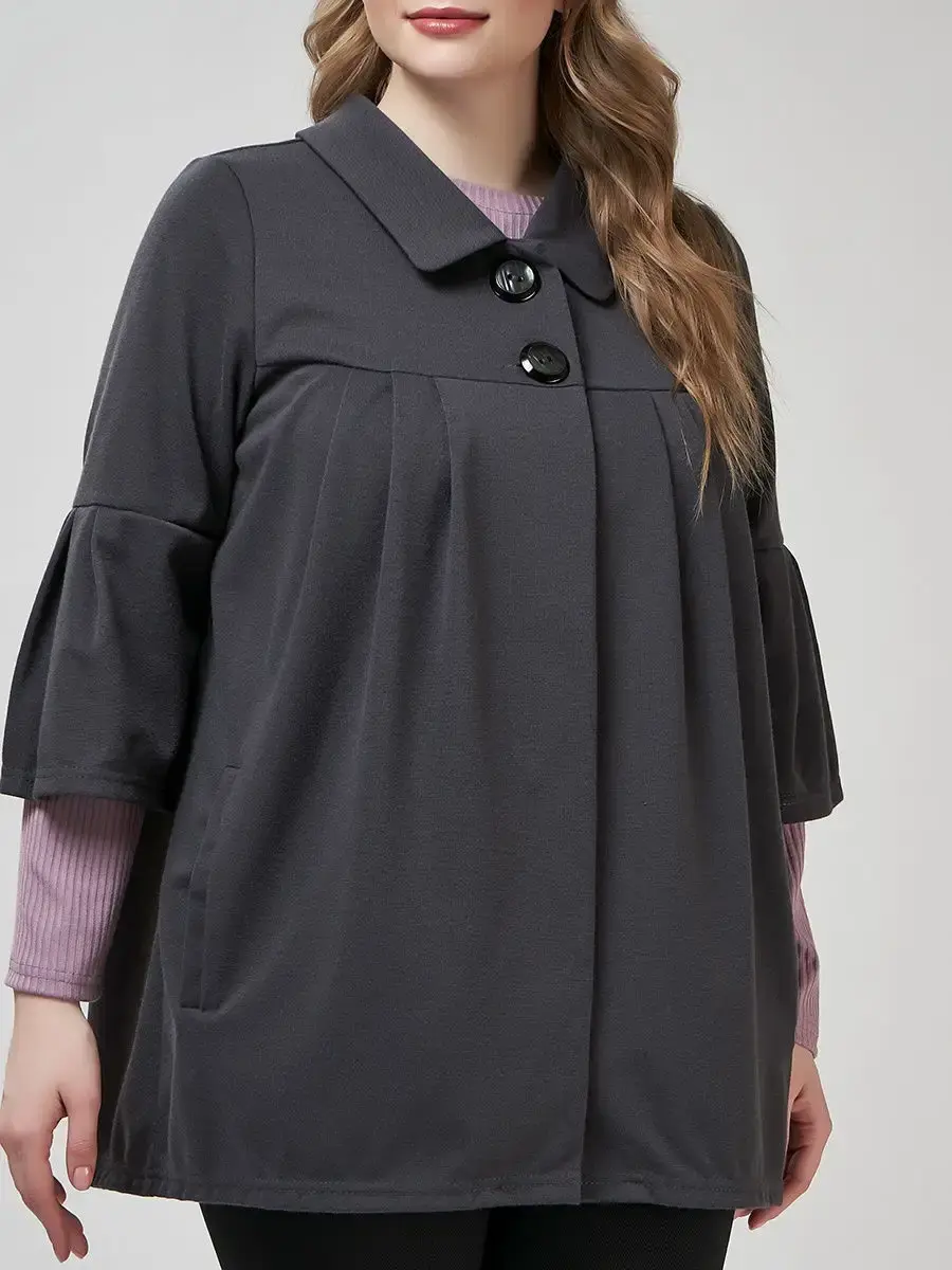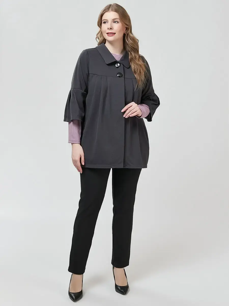 Стильный жакет фантазийного кроя из мягкого трикотажа с отрезными рукавами с воланами, длиной 3/4. Модель на квадратной кокетке с защипами, драпирующими ткань от линии груди, отложным круглым воротником и неглубокой V-образной горловиной. Застежка сверху на двух крупных декоративных пуговицах.