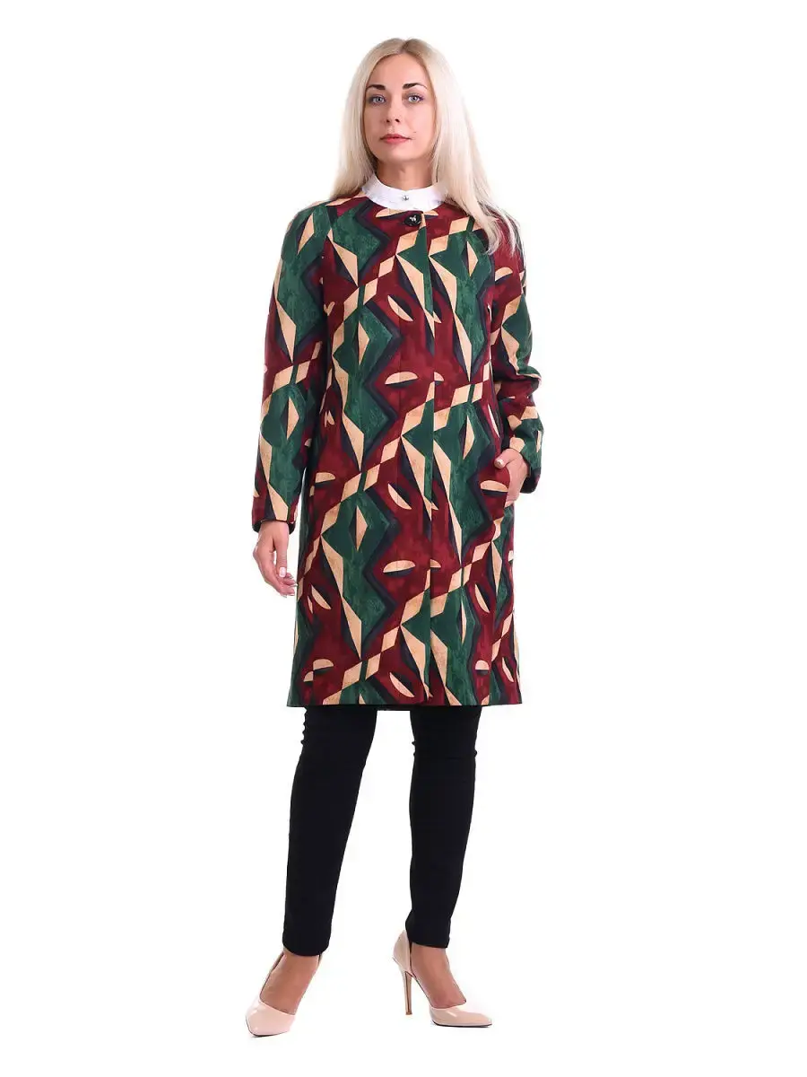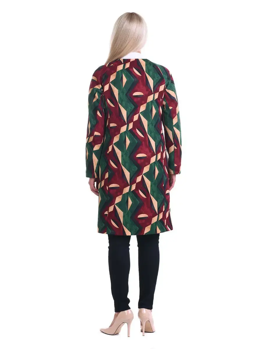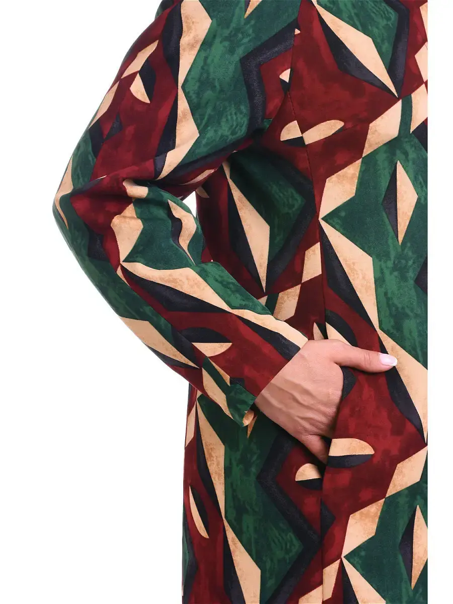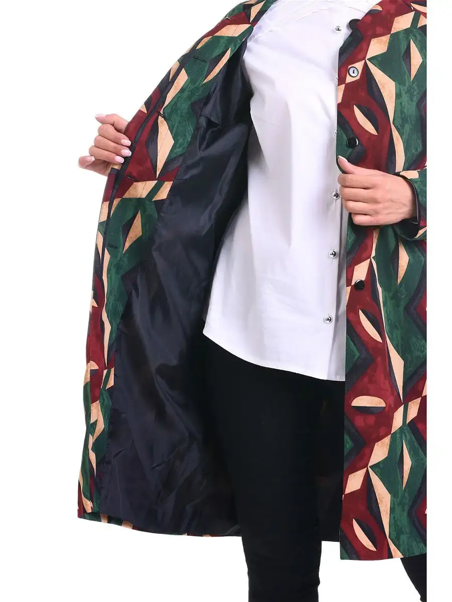 Стильный эффектный женский жакет больших размеров бренда OLSI, из бархатистой ткани с геометрическим принтом. Модель на подкладке, длиной до колен, на потайной супатной застежке, с круглым вырезом горловины, декорированным большой пуговицей со стразом, длинными рукавами-реглан, с врезными боковыми карманами. Весеннее женское пальто лаконичного кроя, подтягивает силуэт и корректирует линии. Комфортное и изысканное одновременно, оно отлично садится на различные типы фигур. Летнее пальто куртка женское большие размеры, женский пиджак удлиненный, весеннее пальто